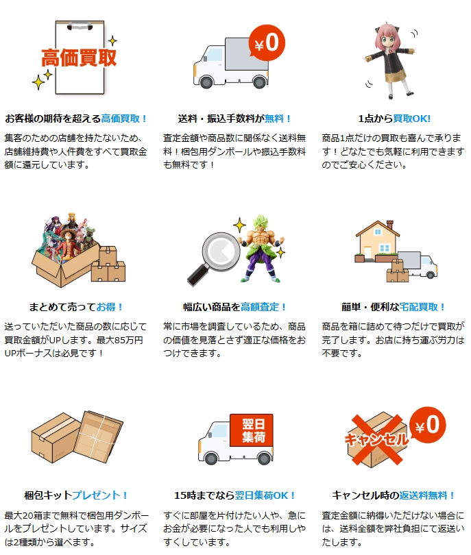 専門鑑定×送料無料×スピード入金。初めての宅配買取でも安心して任せられる、フィギュア買取の決定版。
